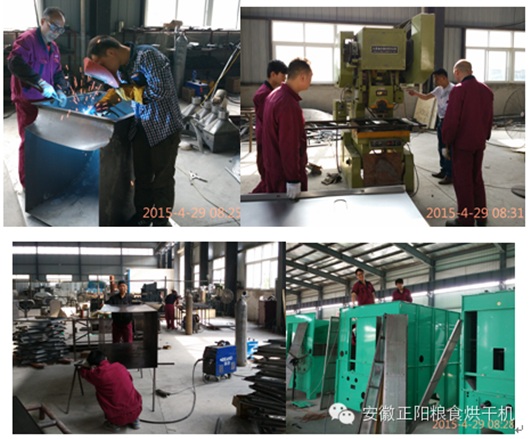 工人們正在車間內加緊生產(chǎn)糧食烘干機,現(xiàn)場機器轟鳴,焊花飛濺。